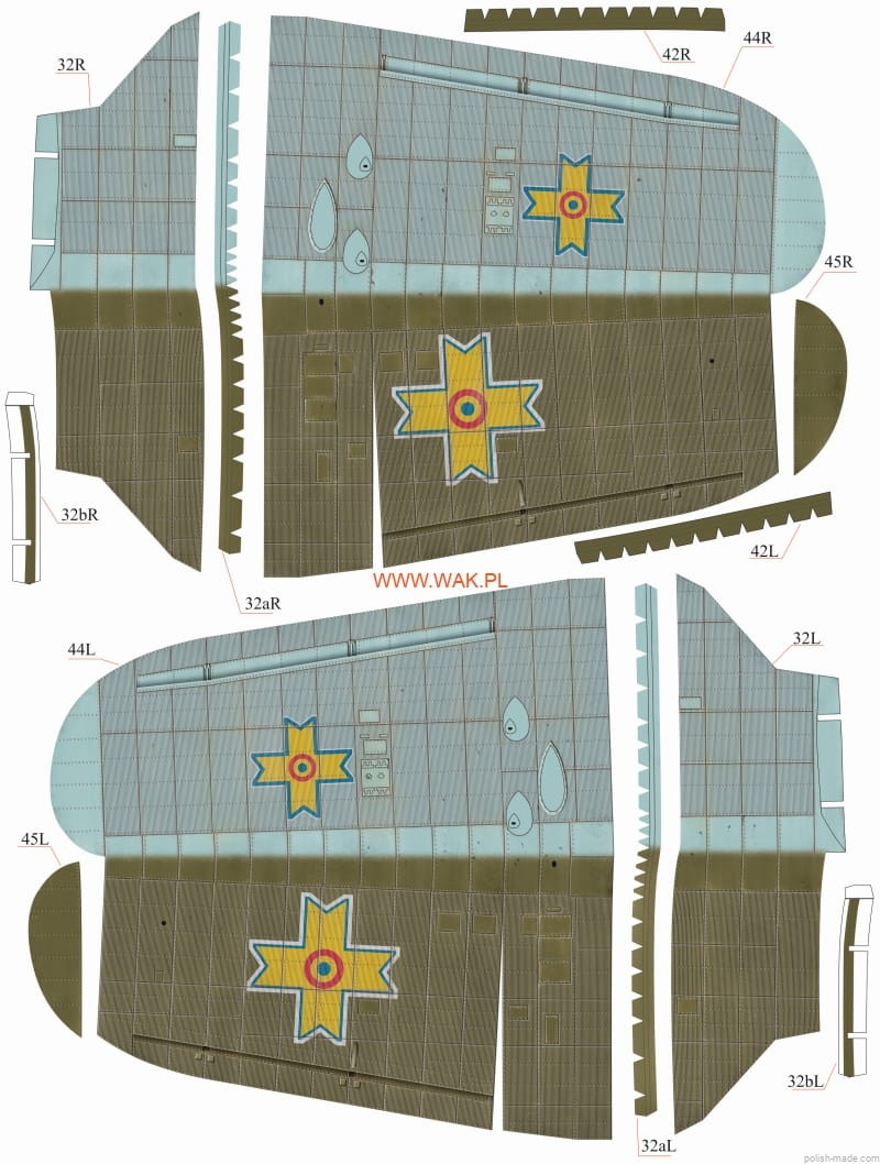 Model kartonowy rumuńskiego samolotu myśliwskiego IAR (PZL) P.11f - eksportowej wersji "jedenastki". Dwie wersje podwozia do wyboru: koła lub narty.