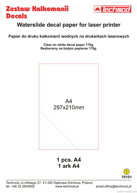 • arkusz jest powleczony warstwą bezbarwnego lakieru, dzięki czemu wydrukowana kalkomania będzie trwała;
