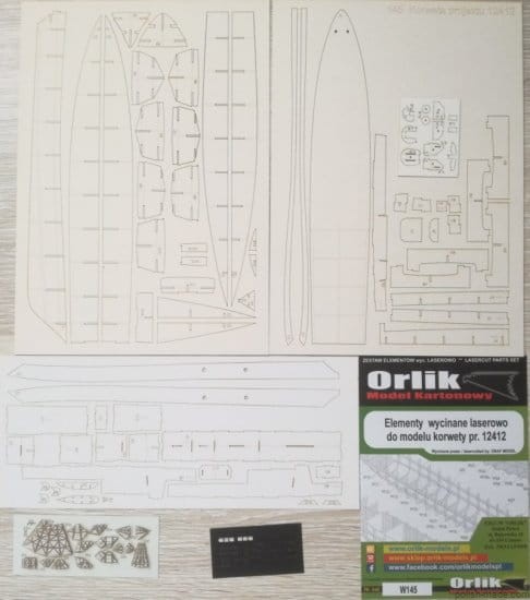 • zestaw arkuszy z wyciętymi techniką laserową częściami wręg i detali konstrukcyjnych dla jednego modelu.