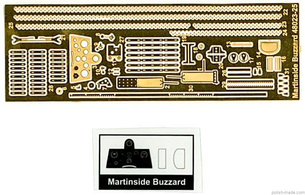• Blaszka fototrawiona z elementami wyposażenia kabiny, podwozia i kadłuba + wiatrochron na przezroczystej folii.